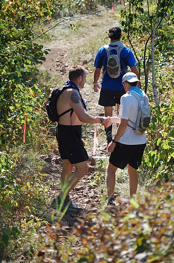 I got into the AS a minute or two before Tim, and found Jay and my first drop bag. It was getting warm already, so I grabbed a handheld from my bag and filled it with HEED before realizing that it was only 5 miles to the next AS, so I dumped it and clipped the handheld to my pack with a carabiner. A volunteer re-filled water into my Nathan pack. I ate bananas, oranges, and potatoes with salt quickly, then saw that Tim was already leaving. I shouted to him to wait a minute while I finished with my pack, but he threw his hands in the air and asked what I was going to do – he was antsy to get going!