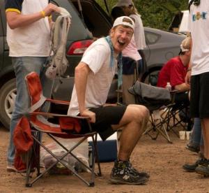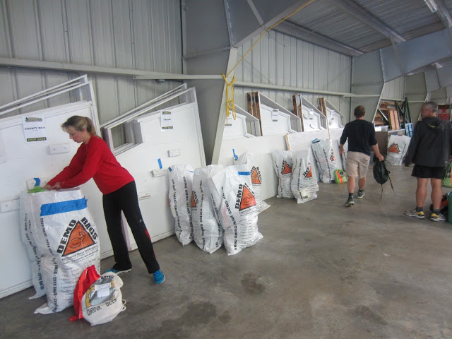 We got to the pre-race meeting shortly after 5, and it was already a-hoppin’. I saw John right off the bat, and he gave me a great pep talk about how I had gone (descended?) from volunteering to the 50 mile to the 100 mile and was now a “returning, hardened warrior”, etc, etc followed by a heavy dose of John-speak adjectives that I can’t remember!! 😉 I had brief chats with a lot of great runners – the pre-race is like a reunion. The energy is so amped with everyone in anticipation. I triple-checked my bag labels as I put all of my drops into the large aid station-separated construction bags.