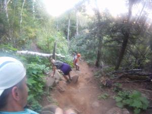 This section has some nice, scenic forest sections. I always think about my work running buddy Brian-the-barefoot-runner who does the Bay-to-Bay race here barefoot! Tim and I hung with Andy Grosvenor and Julie Berg for awhile. Julie’s 2008 Sawtooth race report is one of my favorite race reports ever, and I read it before races to remind myself to think about solutions whenever I find a problem, and to just stay positive. We had a nice chat for a mile or two, and then separated out. I got anxious and passed more runners to keep the pace up.