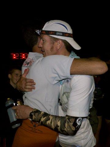 John was at the finish to congratulate me, and I told him I had a fantastic race and took over 5 hours off my last finish time. “Great!” he said, “and next year we’ll take another 90 minutes off!!” Never surrender! I laughed and shook his hand, then wandered around for a minute before I saw Ian, who was on the phone with Neil telling him that I had already finished – these guys need to stop listening to my predictions of when I will come in! I picked up my sweatshirt and buckle, and my 2 stars (for 2 Superior Trail 100 mile finishes). Julie Berg was near the table, and unfortunately dropped due to her ankle, but she congratulated me on my course PR. I grabbed some food and then chatted with Jordan and Ed a bit about their day on the trail. Then I sat down for the first time in 33 hours, and relived the race with Ian, Neil, and Hugh.