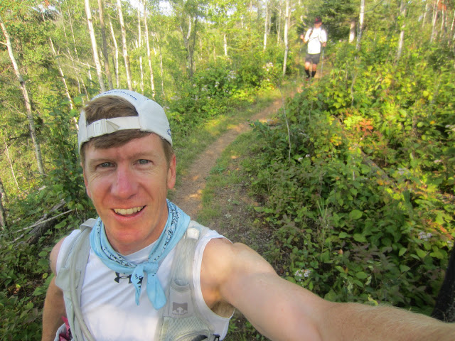 By this time the marathon pack had really spread out, but I still got passed by a few groups here and there. I felt something itchy on my ankle under my timing chip strap and stopped 3 times trying to figure out what it was. On my 3rd stop, one of the marathoners said “you got stung too, huh?” – I guess! I didn’t even realize a bee stung me (lucky only once this year), but switched my chip to my right leg and felt a lot better. I was still trotting the downhills and running the flats, and got passed by Joe Hegman on the way down Mystery Mountain. He was looking extremely strong, and there was no chance I was going to catch him – Gnarly Bandit indeed. But after he passed, I did some internal recap and couldn’t remember being passed on the trail by any 100-milers since leaving Silver Bay (mile 20). I bet I got passed in an aid station or two, but I felt good that I was hitting the trails hard and decided to try to not get passed again.