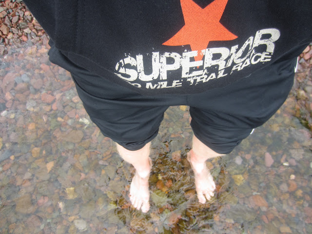 I had spent an unreal amount of time planning and packing drop bags, as I have never had to pack drops before. It turned out to be a fantastic experience to think ahead about my race so much. Thursday morning, I put on the finishing touches, then threw everything into Tim’s car and he, Jay (his crew) and I headed North to meet Hugh. We met Hugh at at Fitgers for an awesome lunch, then wandered up the shore to Duluth Running Co to check out gear, and also chatted with Tony there. We then went up to Stony Point to hang in the sun and let Hugh finish packing drops. I soaked my feet several times in Lake Superior and told myself I would want to be thinking about how cold that felt if it got hot on Friday (<COUGH> – foreshadowing!).